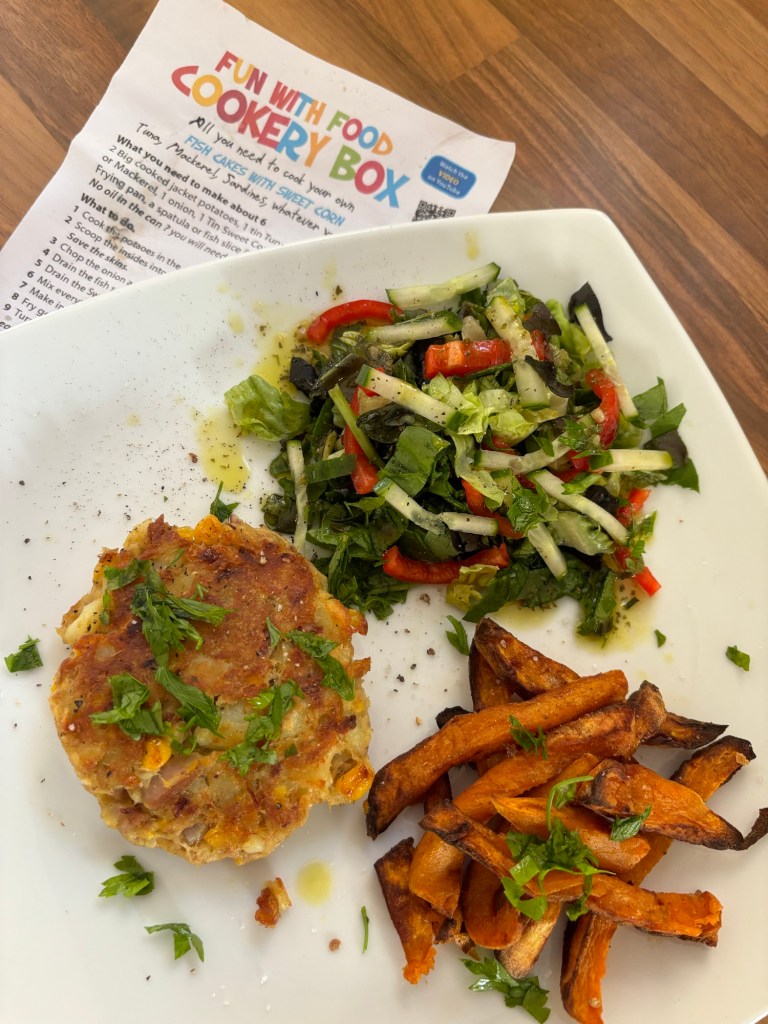The recipe called for home made sweet potato chips but having potentially overdosed my lot on sweet potato when they were babies, normal potato chips were requested and I obliged. I made a small cucumber and red pepper salad to go with it and we had a super tasty dinner that night. This was probably one of the most labour intensive meals from the yellow bags so far but the effort was so very worth it. The fish cakes tasted delicious and were a great way to get a variety of foods on one plate.
